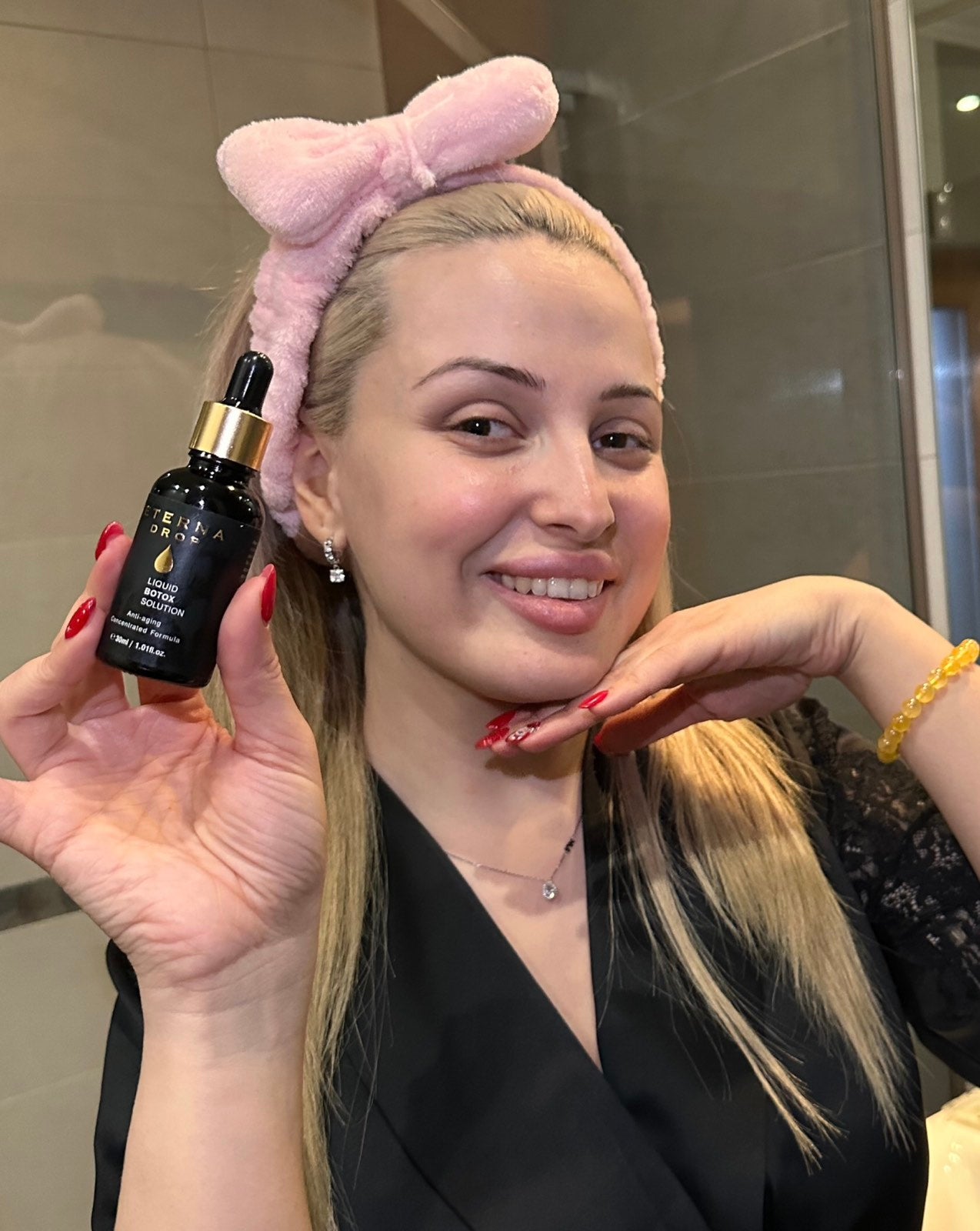 "През годините съм изпробвала безброй продукти за грижа за кожата, но нищо не се доближава до Eterna Drop Botox Serum. В рамките на един месец забелязах значителна разлика в текстурата и външния вид на кожата си. Комбинацията от аргирелин и ботолинов токсин е истинска сила и се бори с моите крачета на гарвана и бръчките на челото като нищо друго, което съм опитвала. Кожата ми е по-гладка и еластична и най-накрая се чувствам уверена в собствената си кожа!"