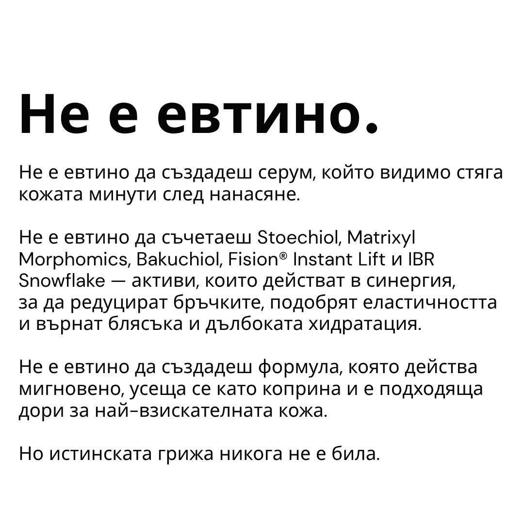 Наричат го "ботокс серум", защото съчетава мощни, моментални изглаждащи ефекти, типични за ботокс процедури – но без игли, без парализа на мускулите и без риск.